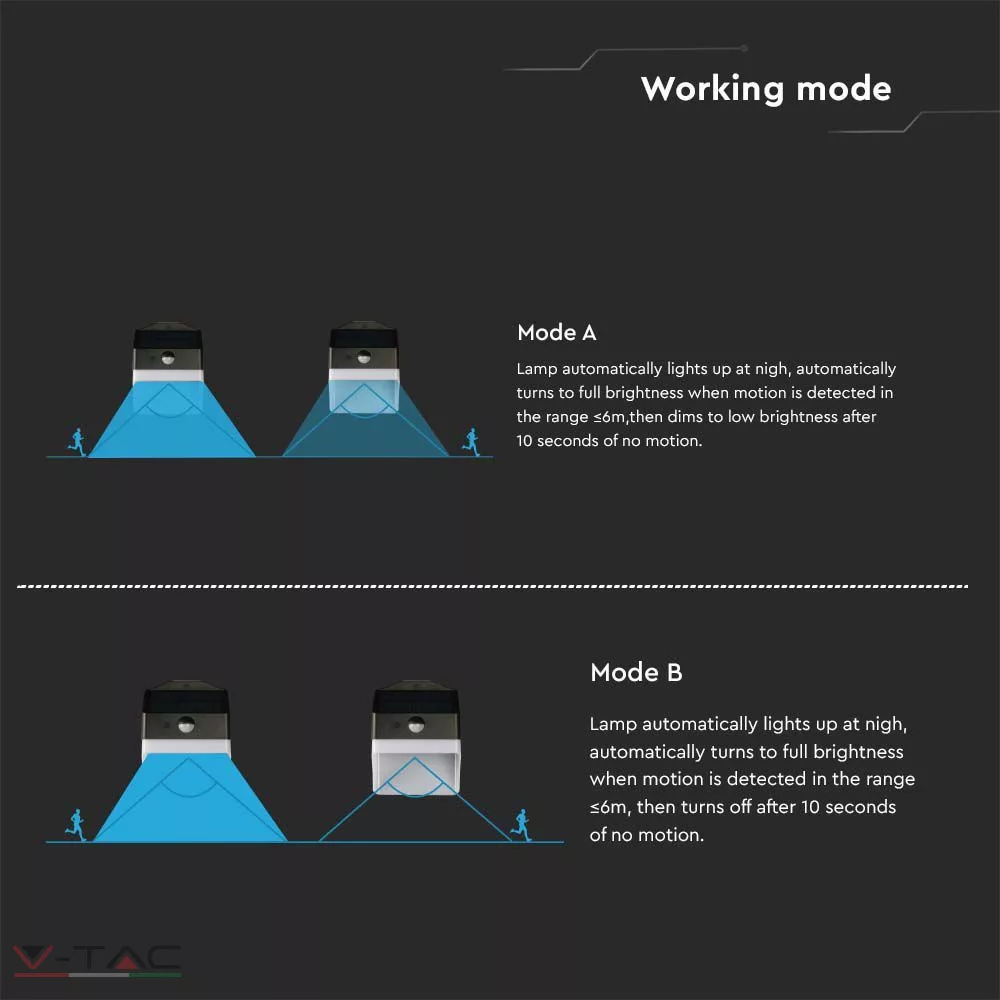 1. Érzékelő mód – A lámpa automatikusan teljes fényerőn világít éjszaka , amikor mozgást észlel, majd ha 10 másodpercig nem érzékel mozgást a lámpa lekapcsol.